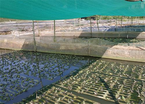 5月13日,筆者來到重慶銅梁區大廟鎮三品村,遠遠望去,青蛙養殖基地的一張張白色網子仿佛像薄霧一般籠罩在田間,走進養殖基地,只見一大片